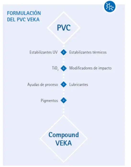 Las características físico-químicas del PVC en estado puro pueden modificarse para dotarlo de las propiedades que cada aplicación de este material demanda. En el caso de los sistemas de perfiles VEKA, los aditivos o micro-ingredientes que se agregan, permiten dotar al PVC de una alta resistencia y durabilidad.